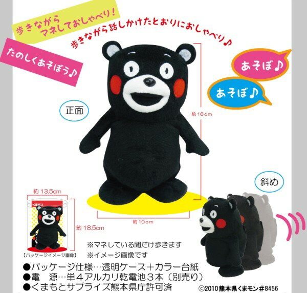 価格: 2,678円 レビュー評価:0.0 レビュー数:0 マネしてトコトコ歩く姿がとっても可愛い★ 歩きながら話しかけた言葉をマネしておしゃべりする 大人気くまモンのキュートなぬいぐるみです♪ ●使用方法● 1.本体後部の布カバーを外し、スイッチをONにします。 2.話しかけると話した内容をリピートしながら歩きます。 ※話しかけた秒数(最長6秒間)分だけおしゃべりしながら歩きます。 ※話しかけない場合は歩きません。 ???????使用上の注意??????? ・本品作動中はおしゃべりしながら動き回ります。 作動中に無理に動きを止めたりすると、故障・破損の原因や 指を挟むなどの怪我の原因になりますのでおやめください。 ・ネジなどの小さな付属品が使用されていますので、 取り扱いの際は周りに乳幼児がいないことをご確認ください。 誤飲による窒息・怪我につながる恐れがあります。 ◆サイズ:約W10×D9×H16cm ◆使用電池:単四電池×3(別売) (更新日時:2017/12/09 15:47) Supported by 楽天ウェブサービス |